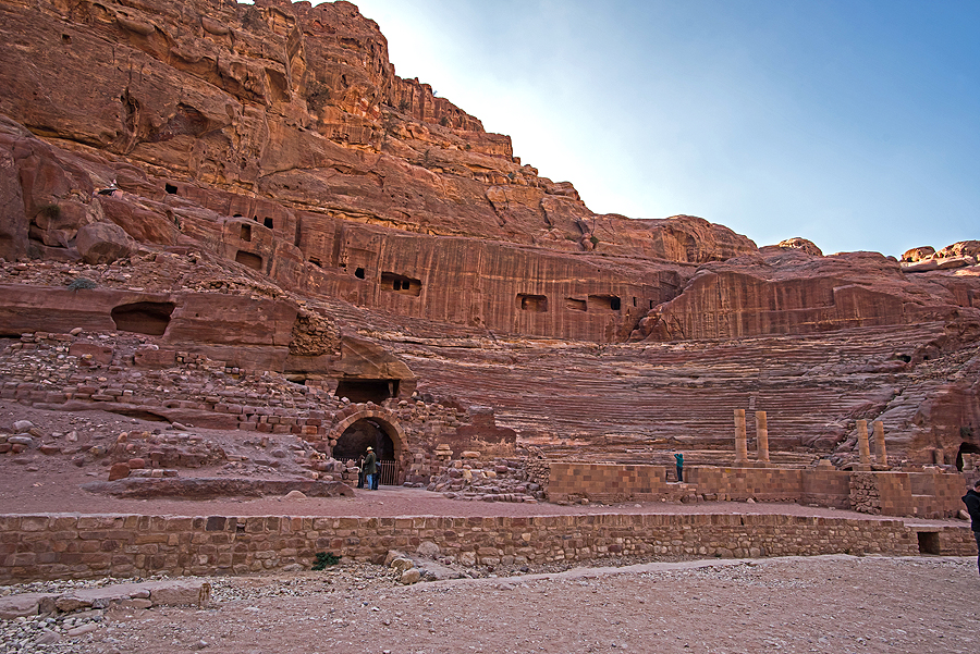 Amiteatras išsidėstęs taip, kad būtų galima žiūrėti į priešais esančią uolą su karališkais kapais.