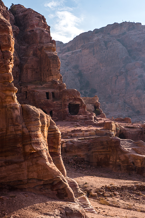 Matau pažįstamą aplinką - turistai, pilna savų, pasidaro drąsiau, einu tolyn nuo grupės. Atsiveria aukštos rausvos uolos, pilnos grovių griovelių... Skaičiau, kad tai - kapai.