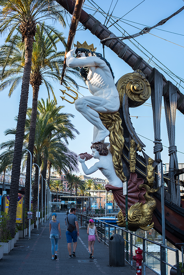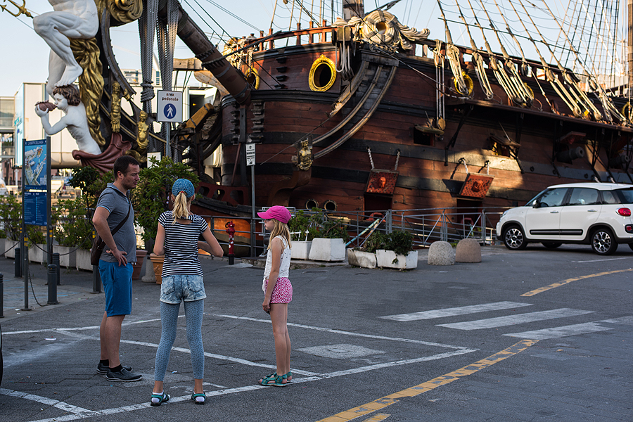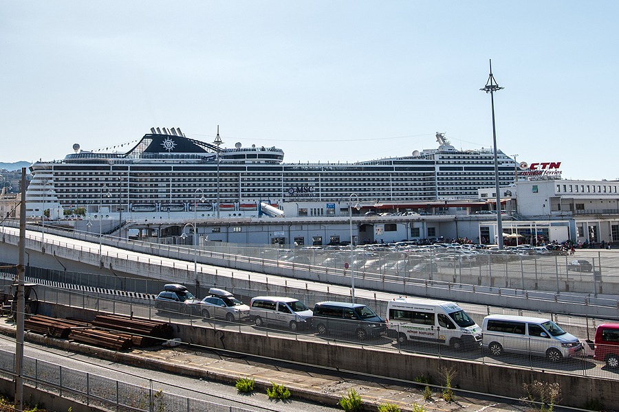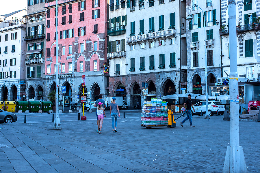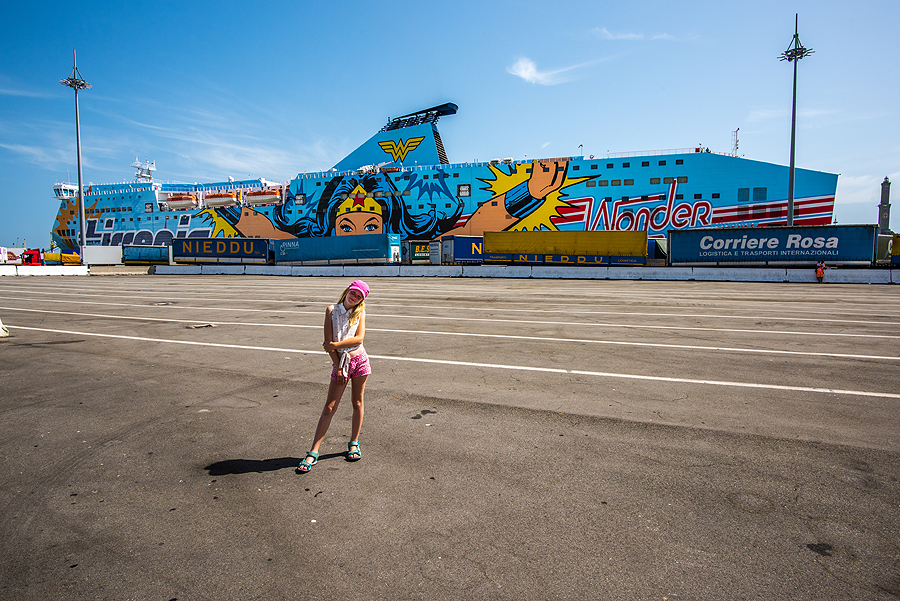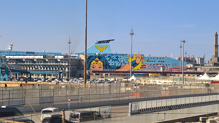 Buvom Genujoj prieš du metus. Kai kurie praėjimai, tada remontuojami, iki šiol teberemontuojami... Uostas didelis ilgas, keltų dydis įspūdingas. Matome ir saviškį - su Wonder Woman, vaikams įspūdis! Mus prisiims tik apie 19 val, tad dar turim krūvas laisvo laiko..