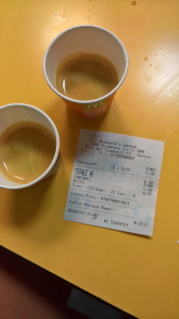 Na ką, ir vėl mes makdake - šnipštas iš skambaus pažado, duoto ryte. Perkam kavos - duodam vaikam 5 eu, vyras sako, gal neužteks, imkit dar 20. Ir paimkit du dvigubus espresus. Grįžta Miglė, duoda 4eu ir kavą. Mes - kąą, tai kiek kainavo??? Rimtai, kava po 50cnt ir Lietuvoj?