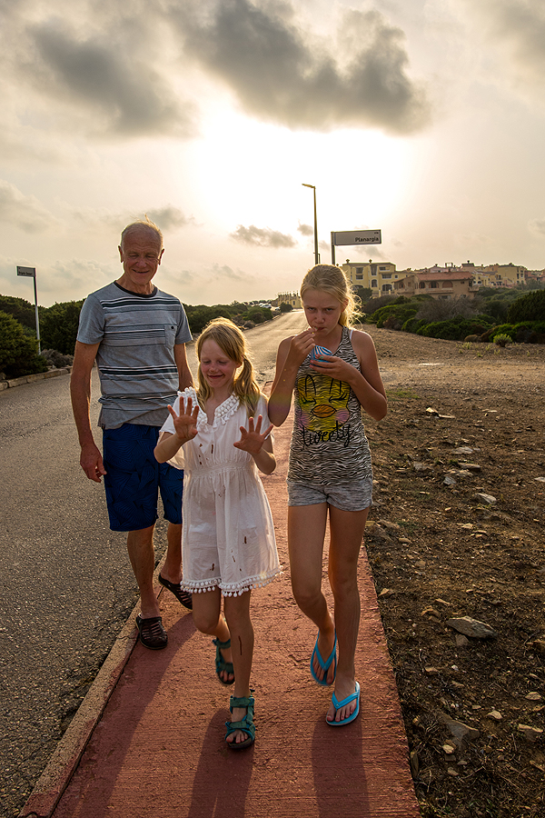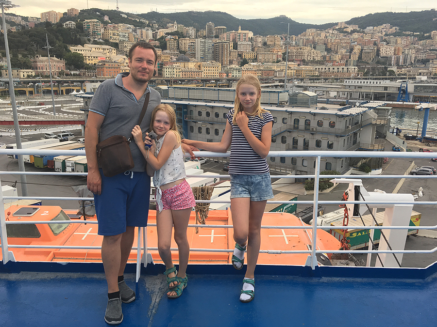 Atostogos prasideda. Šįkart važiuojame mašina ir keltu Genuja-Porto Torres, Sardinija. Einam miegoti 9 val vakare, atsikeliam 12,30 ir išvažiuojam virš 500km. link Genujos. Naktį, nes prasideda atostogos keliuose aplinkiniuose Šveicarijos kantonuose, o tai reiškia, kad Gotardo tunelis per Alpes vedantis link Italijos ir jūros, bus užsikišęs neįmanomais kamščiais. Be sustojimų, be kamščių, 6 ryto mes jau Genujoje. Niekas dar nedirba. Einame susižinoti, kada priims mašiną į keltą, tai 1,5km nuo mašinos pastatymo. Tada atgal - pavalgyt šalia mašinos. Tada vėl į priekį - nes pirmą kartą dar neveikė ofisas :D Tada į miestą, į centrą. Jau antrą kartą Genujoje pasiklystame, malamės per karštį, centro nerandam, vaikai kas 10 min klausinėja, kiek liko laiko iki kelto... Finalas - kai 7 vakaro mus galų gale prisiima keltas, išmanus laikrodis rodo, kad tą dieną nuėjome daugiau, nei 32 000 žingsnių :) Na, ir nieko. Šiek tiek pavargę buvom.