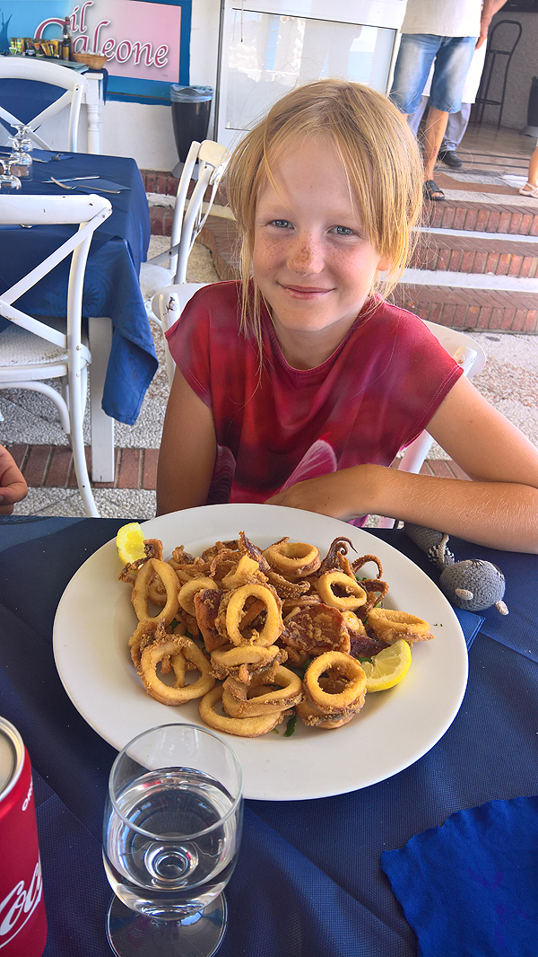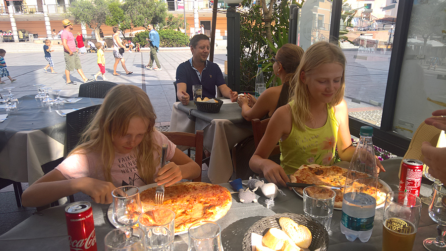 Mažė laukia, kol bus supjaustyta jos pica ir saugo tėčio kalmarus. Šypsenėlė reikškia - cha, tai tikrai ne mano maistas!