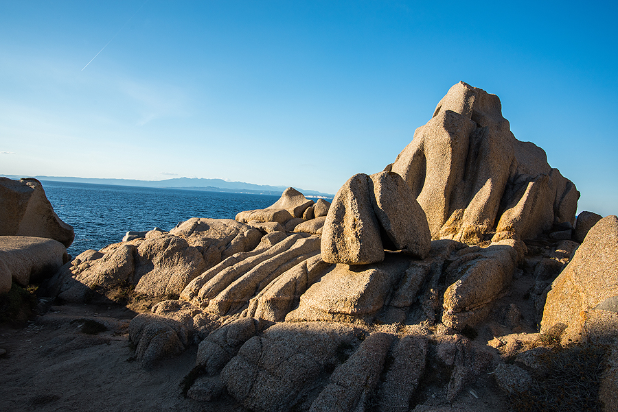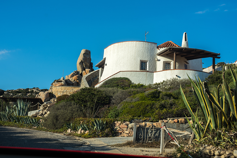 Važiuojame link Capo Testa - tame iškyšulyje yra mano nusižiūrėtasis Mėnulio slėnis. Čia pravažiuojame pro namą, kurio kiemo stypso milžiniškas akmuo, gaila, nespėjau nufotkint iš kitos pusės.