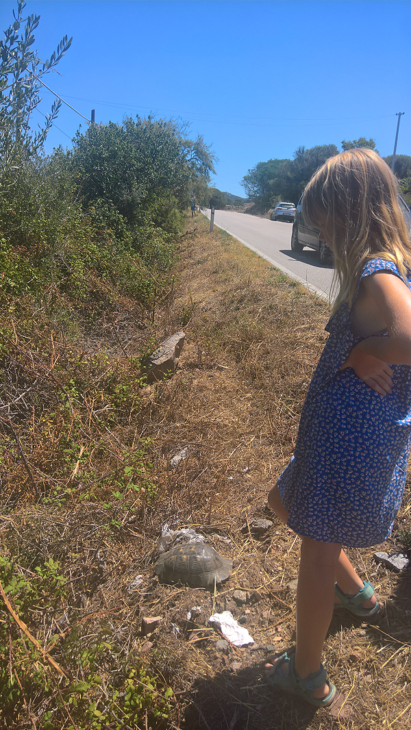Pakeliui mažas kamštukas - ant kelio vėžlys ropoja. Vienas vyras nuneša jį į šalikelę, o mes sustojam apžiūrėt.