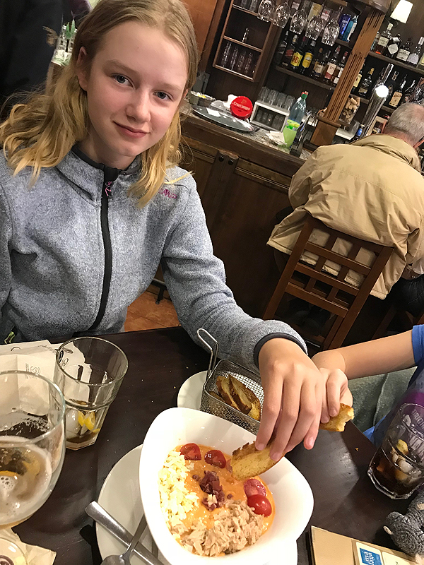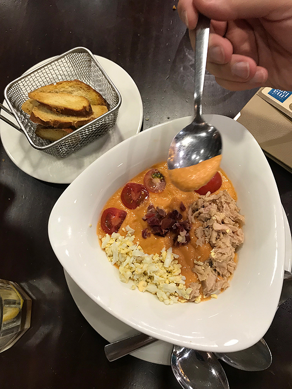 Toliau valgome gido rekomenduotą patiekaliuką - gaspačio - kaip užtepėlę, tik šaltą. Nerealu! Sotu, skanu.