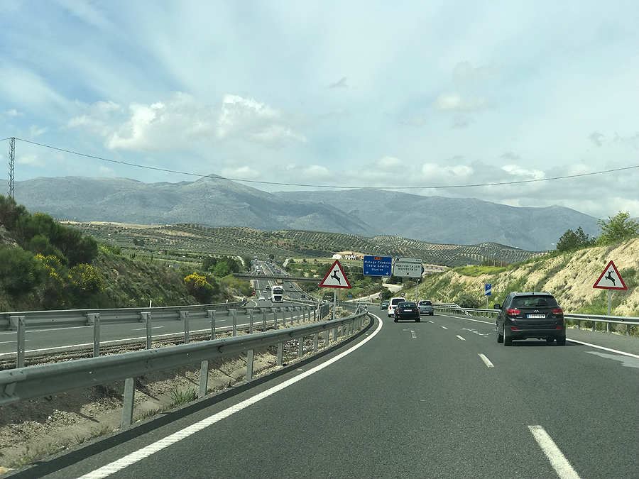 Ir į gražųjį kelią vėl - kalvos, nusėtos alyvmedžiais, be galo. Dalis jo kartojasi - važiavom jau vakar. Svarstom ar stoti miestelyje pavadinimu Loja, bet apsukus kelis ratus ten, nusprendžiam, kad neverta, važiuojam pietų ir pramankštint kojų į Antequera.