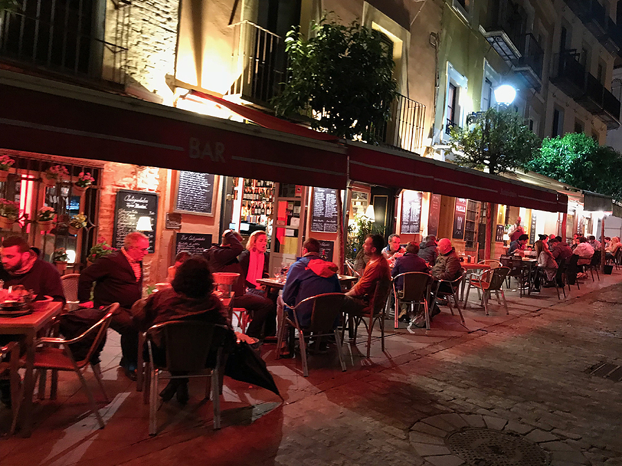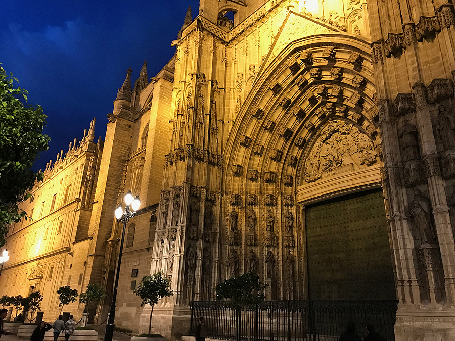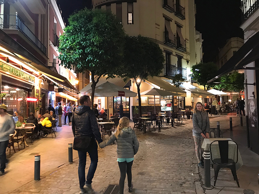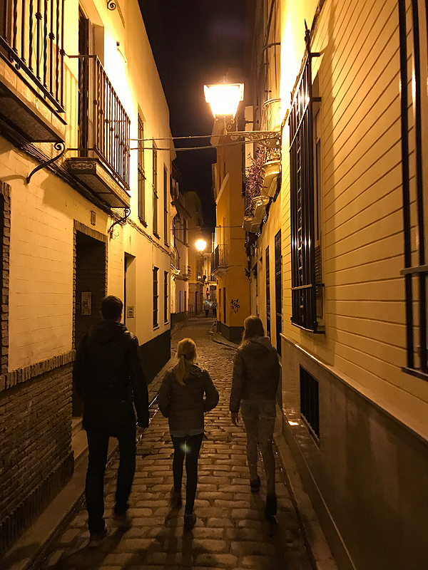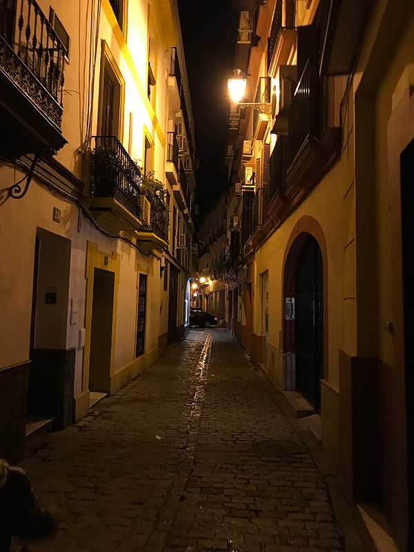 Kiek ėjome sutemus po naktinę Seviliją - net mažiausia skersgatvinė gatvelė apšviesta.