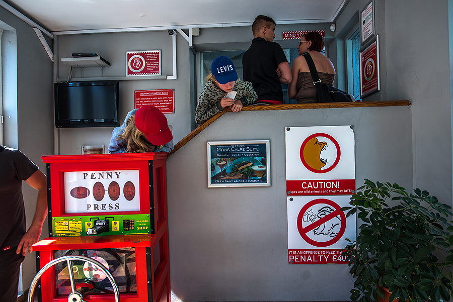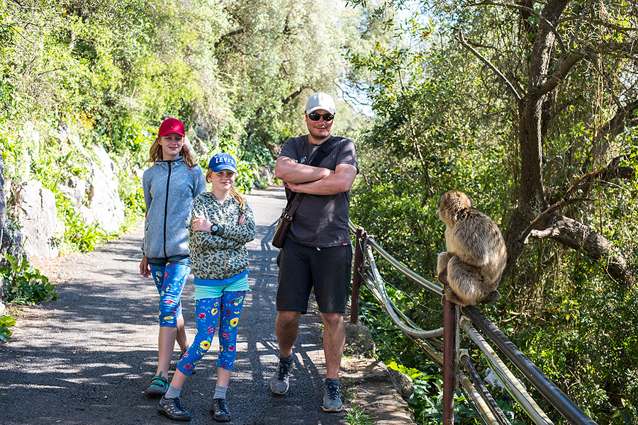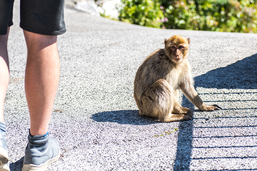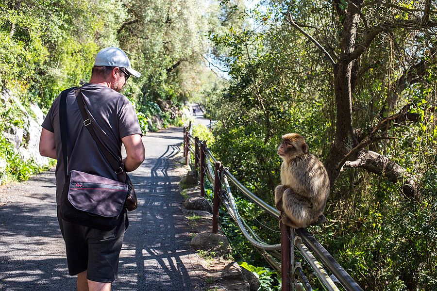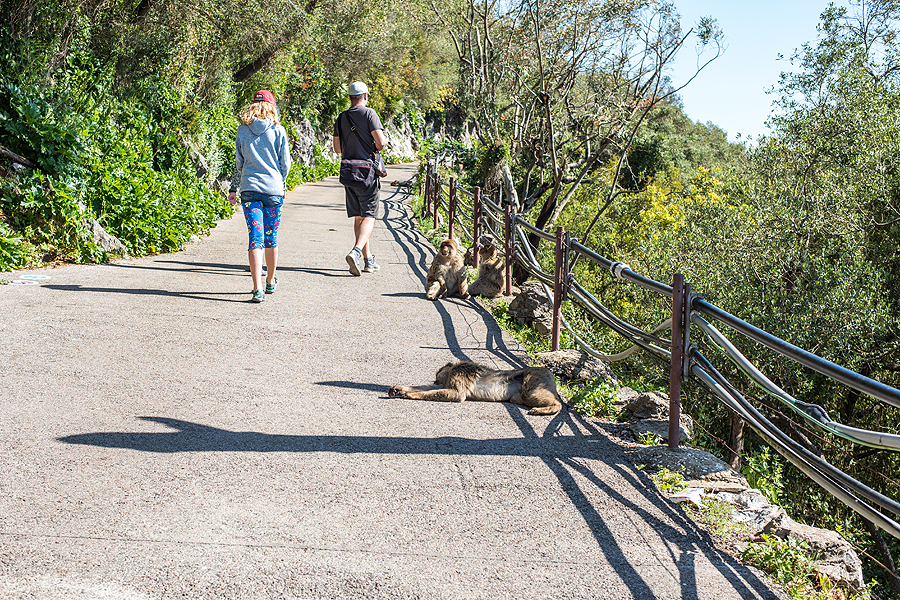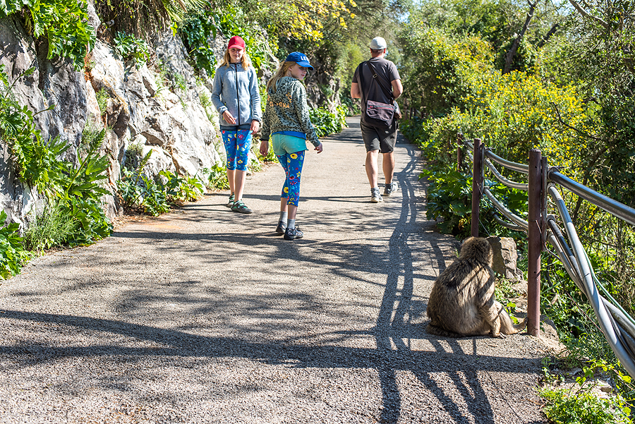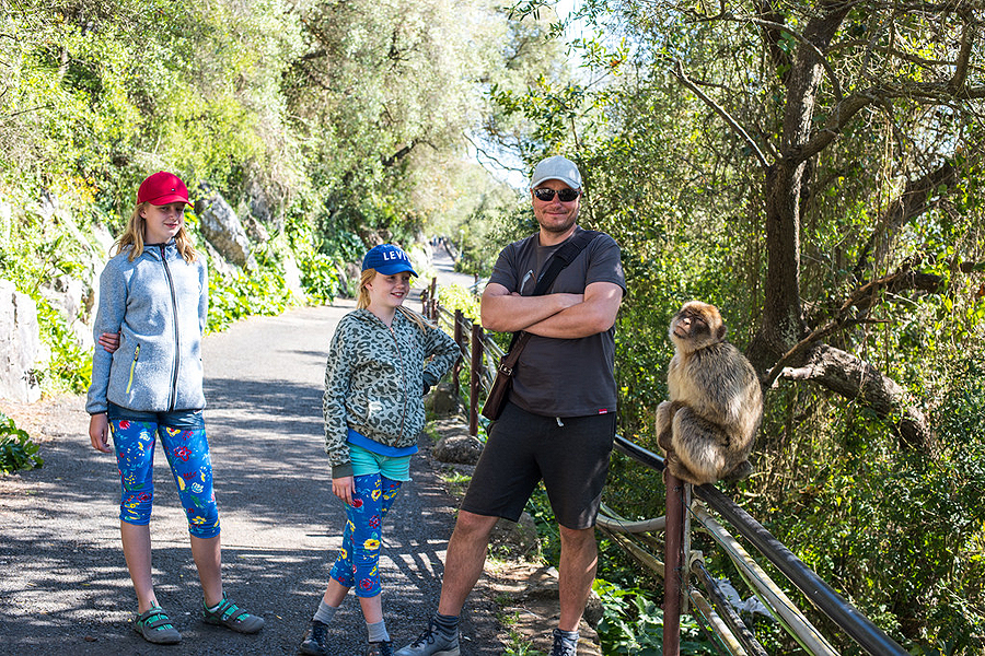 Išlipus iš keltuvo pasitinka štai toks dėdė. Oi, bus linksma! Atrodo, dėl beždžionių nemelavo. Paskui perskaičiau, kad gyvūnai per pirmąjį pasaulinį karą buvo beveik išnykę, bet Vinstonas Čerčilis įsakė atgabenti jų papildomai iš Afrikos, kad vieta neprarastų savo unikalumo. Dabar pastoviai palaikomas beždžionėlių skaičius apie 200.