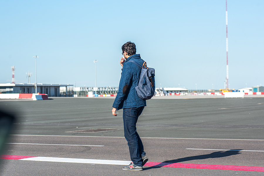Žmogus, einantis į Ispaniją iš Gibraltaro per lėktuvų pakilimo-nusileidimo taką.