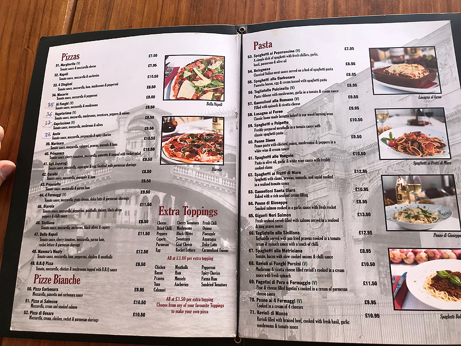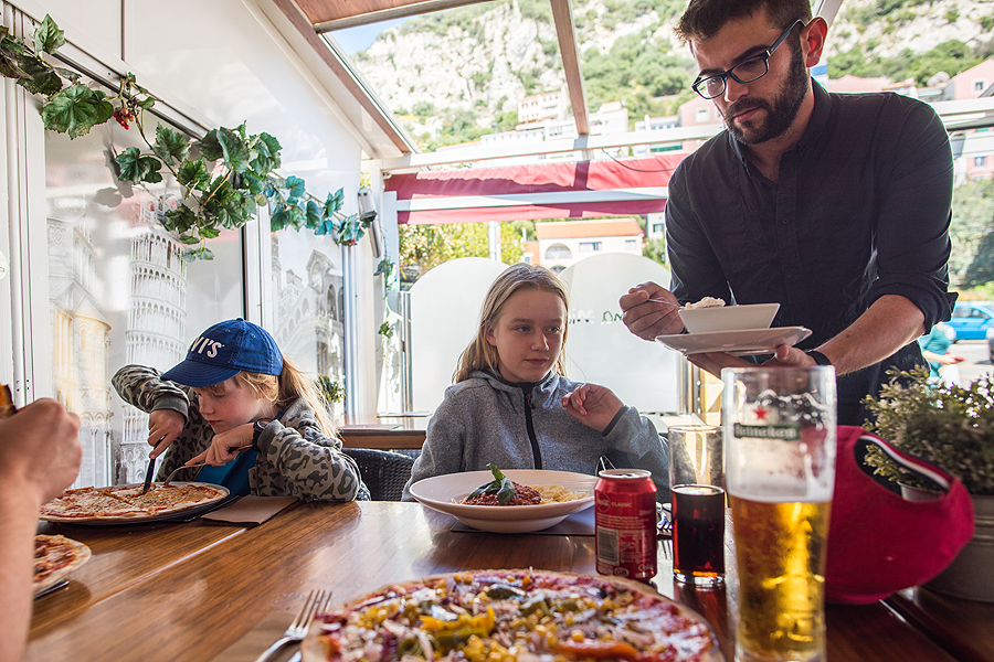 Bet jau labai buvom alkani, kad nusileidom vaikams. Picerija šalia keltuvo, patogu. Kainos svarais, pagerintos tokios, aukštesnės, nei Ispanijoj, bet mažesnės, nei Šveicarijoj. Padavėjas kalba švariai angliškai, puiku.
