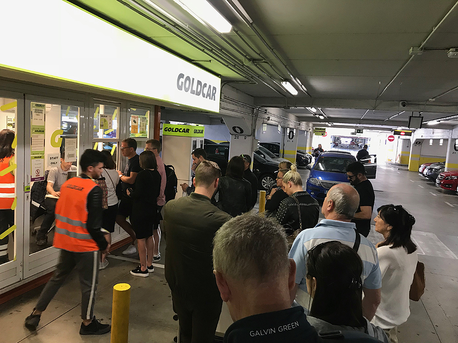Malagoj atsiduriam ne 12.10 nakties, o 12.40 - tikimės, kad viešbutis laukia. Vaikai zirzia, bet gavę kolos pradeda siaust. 20 eu taksistui nuo oro uosto iki viešbučio - apie 4-5km važiavimo. Nakvojam Ibis Budget - Accor tinklo, mūsų mėgstamo, viešbutuke. Mašiną imam iš Goldcar, jie suteikia galimybę ją išsinuomot be kreditinės kortelės (savaitė kainavo apie 180 eu - pigiau grybo). Šimtą metų užtrunka, kol gaunam mašiną, eilė prie ofiso milžiniška. Na, gerai, gal ir neatrodo iš foto milžiniška, bet kai su kiekvienu vozojas po 15 min...