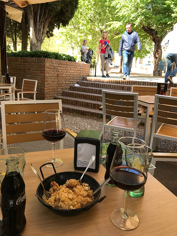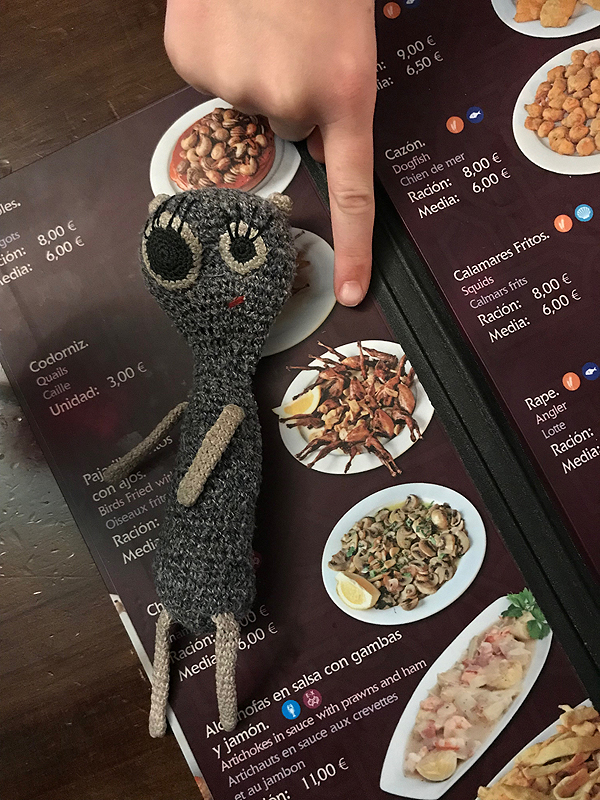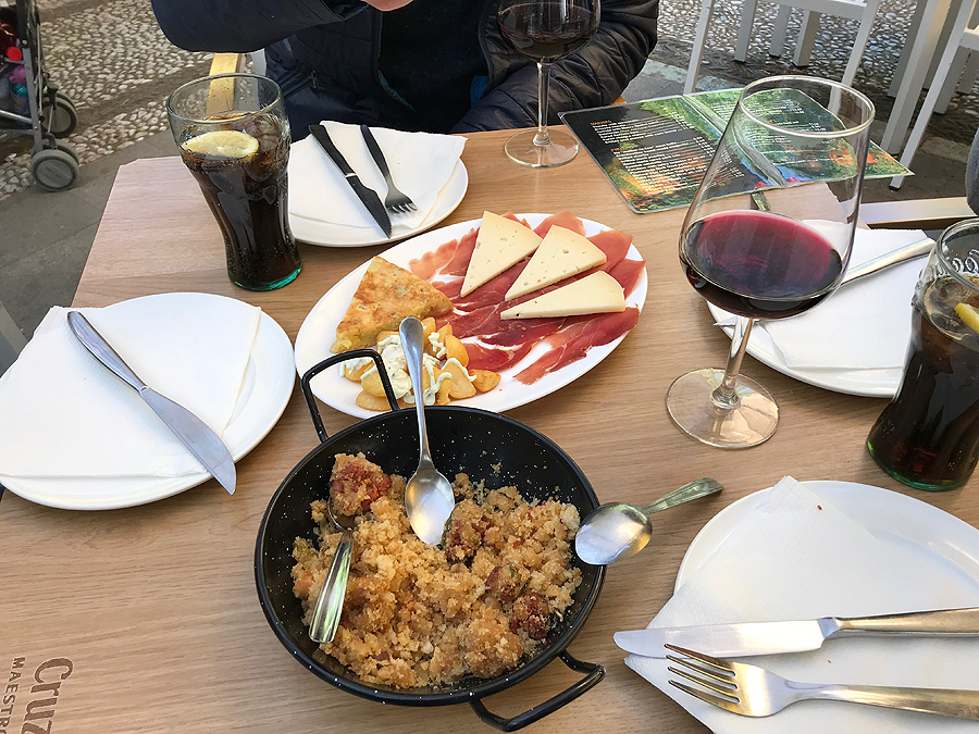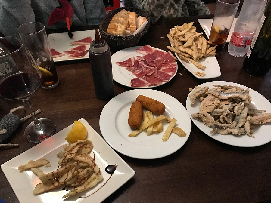 Tik padavėjui supratus, kad nekalbame ispaniškai, pašaukiamas anglakalbis padavėjas, labai malonus. Geriam vyną, valgom mano iš Barselonos pamėgtus skrudintus kroketus su špinatais, žuvim, gaunam dar kažkokį naminio maisto marmalą "tai kas liko iš vakar pietų". Bet skanus.