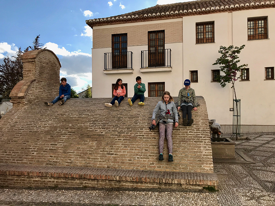 Kai galų gale išeiname iš Alhambros grožių, leidžiamės į apačią ir ieškom ko nors valgomo. Aptinkam labai fainą užeigėlę Taberna Tofe, Campo del Príncipe, 18. Šalia parkelis su vaikų žaidimų aikštele, kur "prapuola" mūsiškės.