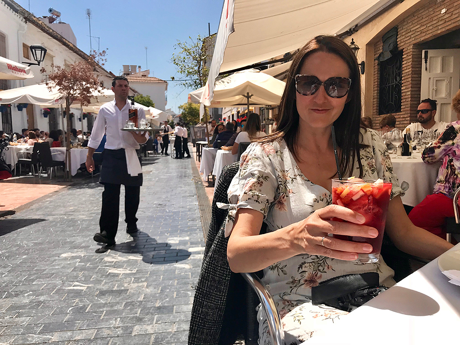 Jau sėdim, laukiam maisto. Tokia super turistinė vietelė, maistas bele koks, bet kai esi alkanas, sueina. Ta sangrija irgi tik iš idėjos, realiai geriau baltas vynas grynas.
