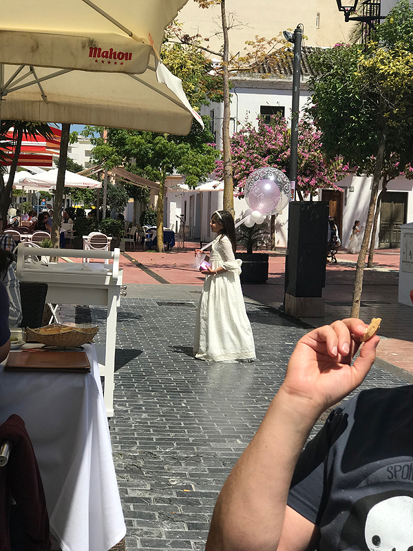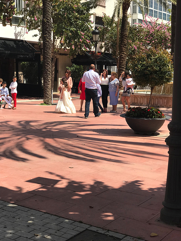 Štai šioje gatvėje mes randame savo maistą. Nebuvo ypatingai skanu, eilinis maistas, net pamiršau, ką valgiau. Sangrija irgi šiaip sau. Bet įdomu buvo stebėti gatvės spektaklį, šalia vyko baliukas po krikštynų, pasipuošę visi, vaikai irgi.