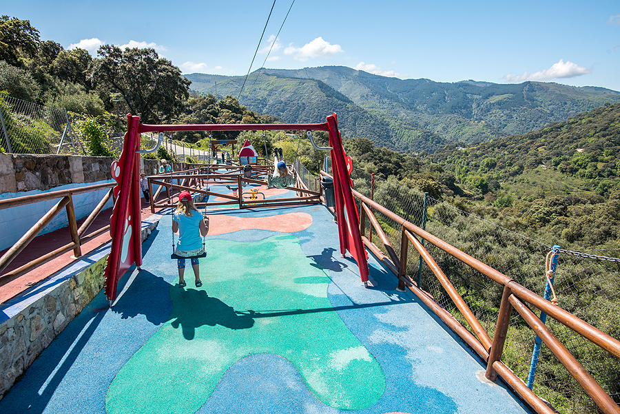 Gale miestelio radome mažytę žaidimų aikštelę su panorama į kalnus.