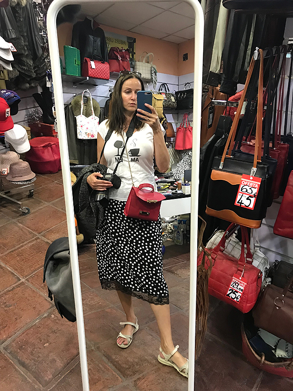 Ir tada pradeda krapnoti žadėtas lietus. Einam link namų, slapstydamiesi po stogų atbrailom, įlysdami į suvenyrų parduotuves. Vaikai išsikaulija odinių piniginių - pilna gaminių iš odos. Aš nusiperku skarelių.