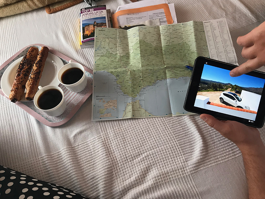 Per tą laiką spėjau prisižiūrėt, kur nuvažiuot, paplepėt apie nekilnojamą turtą šalia Cadiz (čia dar bus dažna tema kokį mėnesį po kelionės), išgert kavos, peržiūrėt foto. Mūsų su vyru laiko stūmimas atrodo taip: