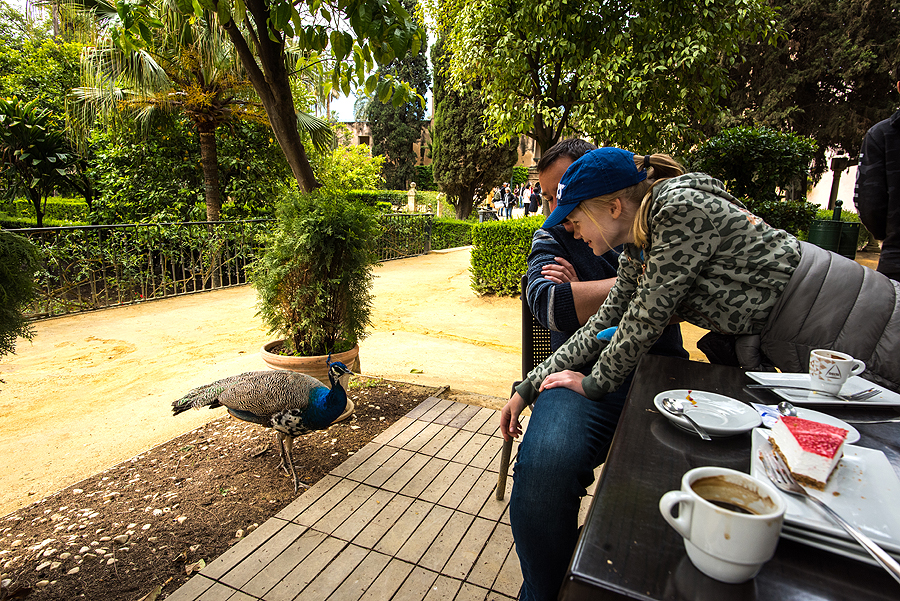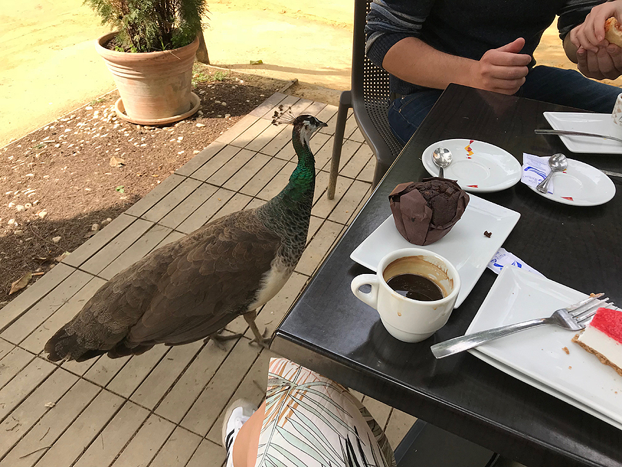 Tada nuėjome į kavinukę. Ir ten pasijaučiau, kaip svajojau - gerti kavą karališkame sode. Aplinkui vaikšto povai, ir prašinėja maisto, virš mūsų paukščiai dauginasi. Šilta, gera, augalija, gyvūnija, patenkinta šeima - nuostabu.