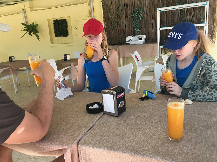 Tuoj eisiu pas šeimyną, mokysimės ištarti zumo de naranja - apelsinų sultys, tariasi cumo de naranka. Kaip sunku! Jokių tarptautinių žodžių...