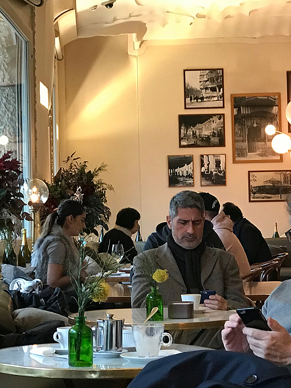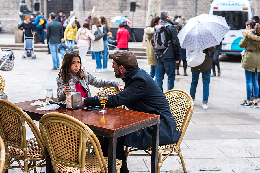 Sėdim ilgai, plepam, fotografuojamės ir apkalbam toliau sėdintį vyriškį, įsmeigusį akis į telefoną. Žurnalisto dukra Elena tuoj sukuria jam istoriją. Aš rodau, kaip fotografuoti žmones, apsimetant, kad fotografuojies pats. Linksma.