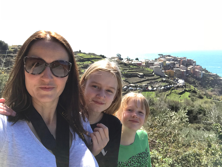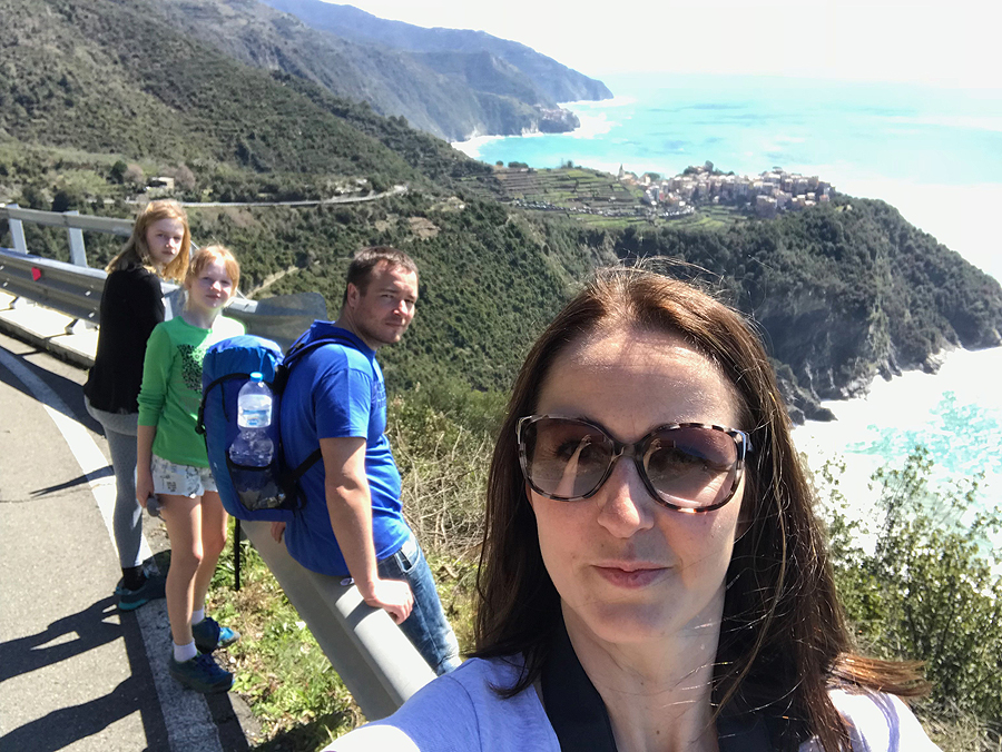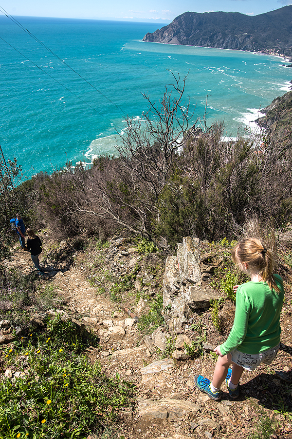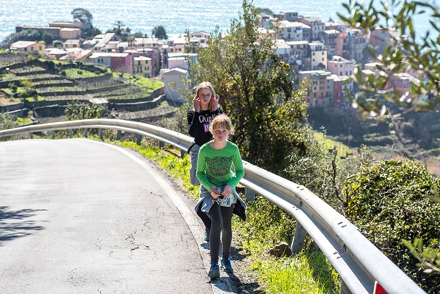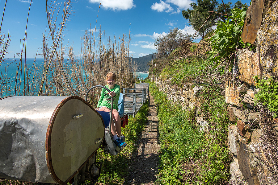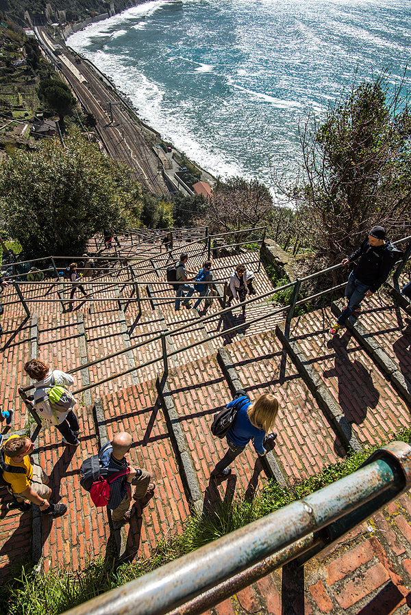 Atvažiavus į Corniglia stotį, (tarti reik Kornilija) - reikia lipti 400 vnt. laiptelių (čia tiksliai - skaičiavo vaikai) į viršų iki pačio miestelio (yra ir keliukas mašinoms - tad su vežimuku galima užvažiuoti nekylant laiptukais). Ropščiamės vargais negalais.
