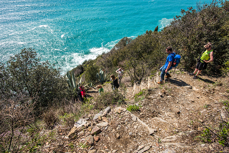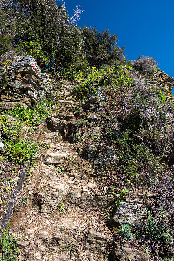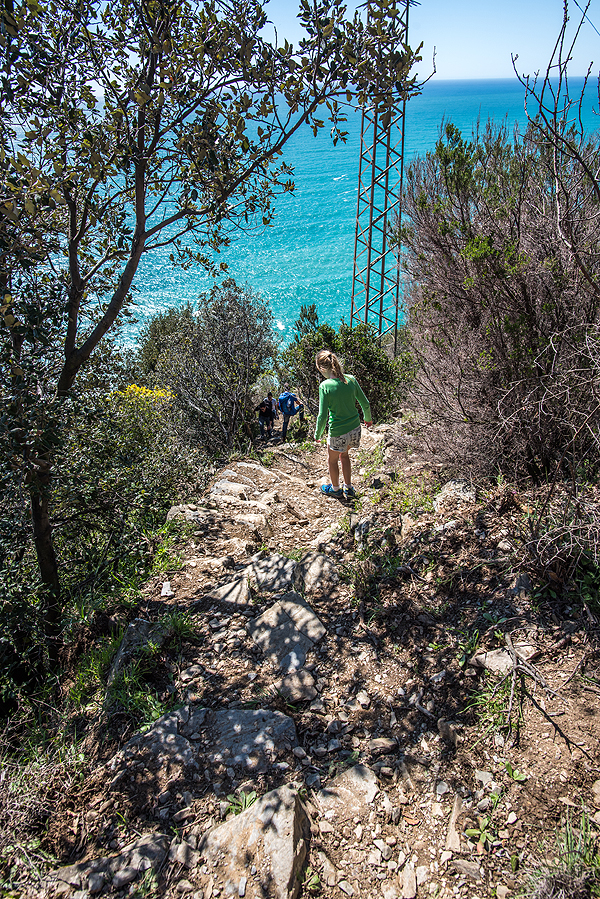 Nusprendžiam nuo Corniglia iki Vernazza eiti pėsčiomis , bet trumpas, valandos trukmės takas uždarytas dėl saugumo - nors mačiau žmones juo marširuojančius. Nuotraukoje - tas nesaugusis takas, kuriuo matome vis ateinant žmones nuo Vernazzos pusės. Bet mums juo eiti draudžia užtvertas kelias ir moteriškė sargo būdelėje.