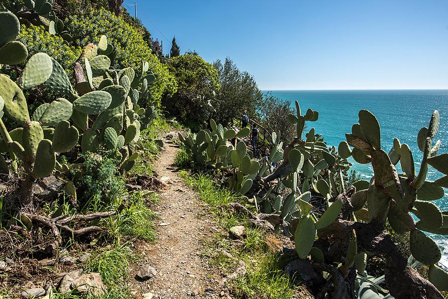 Tako pliusai - atsivėręs Vernazza vaizdelis iš viršaus ir gražuoliai kaktusai kelio gale.