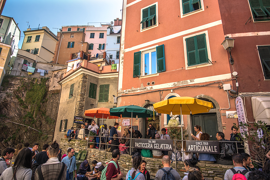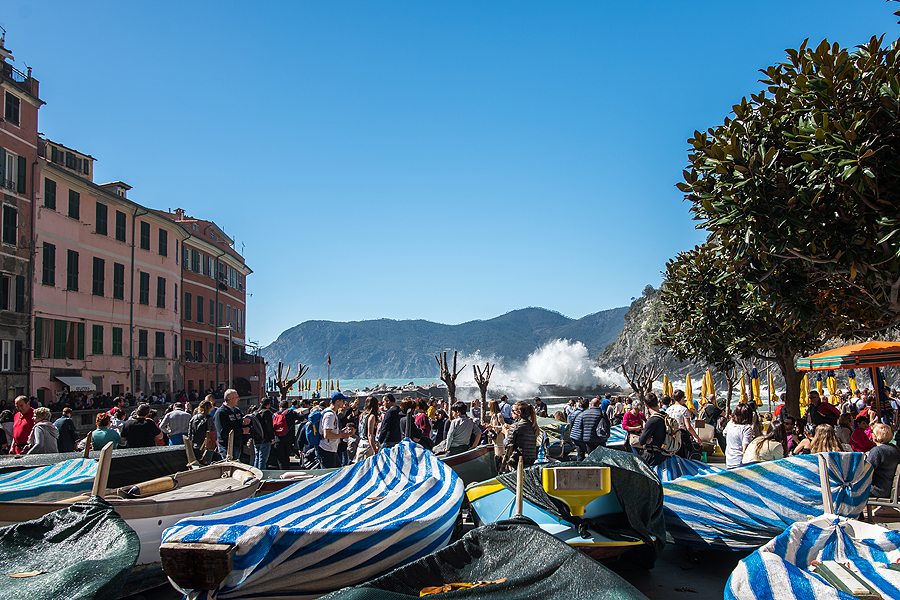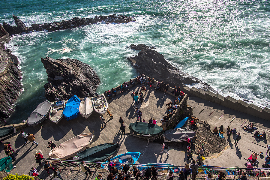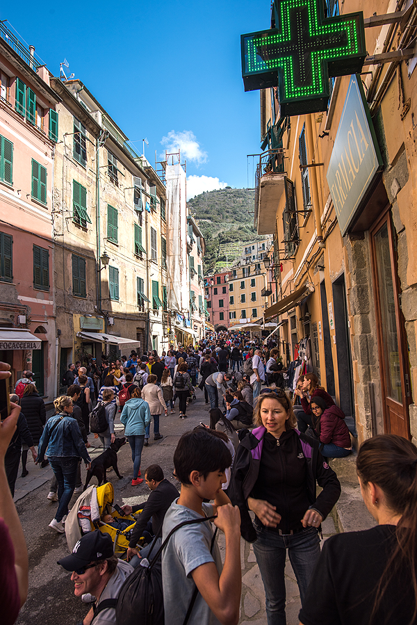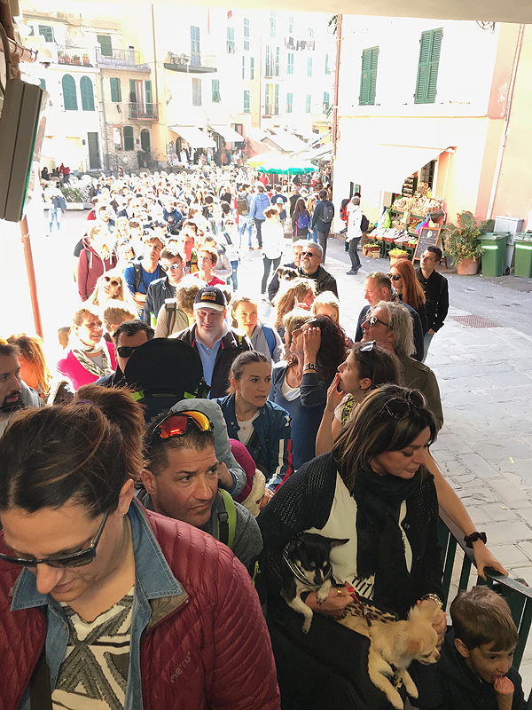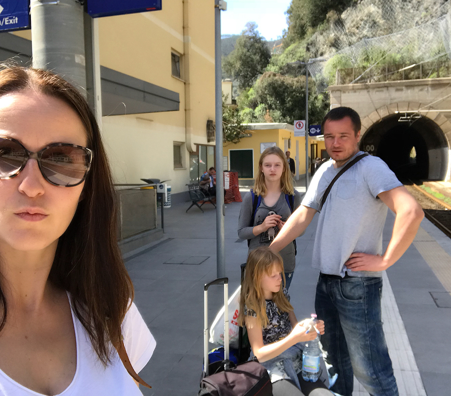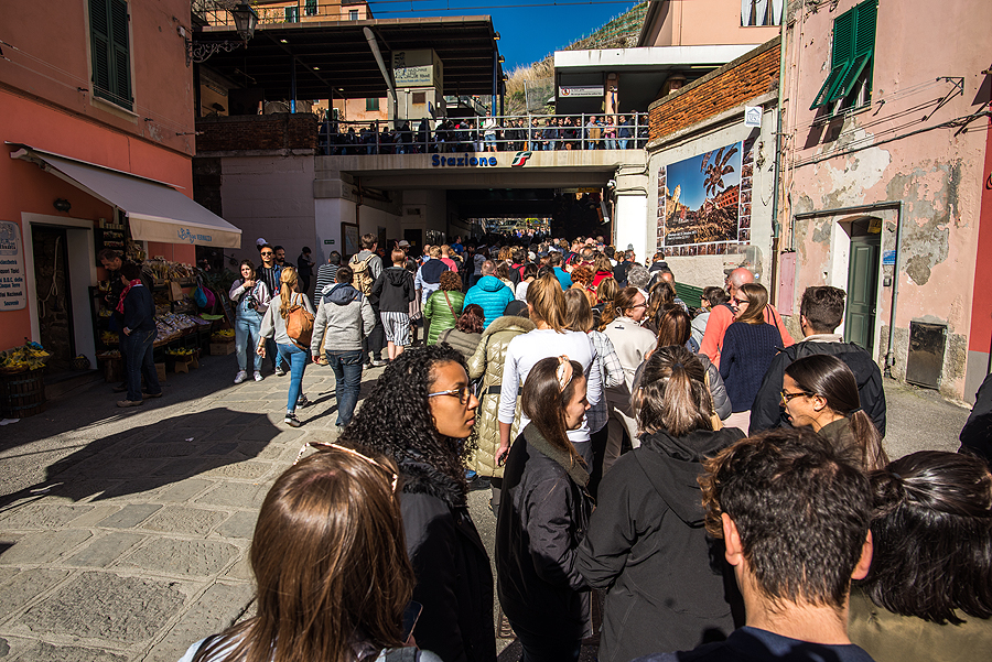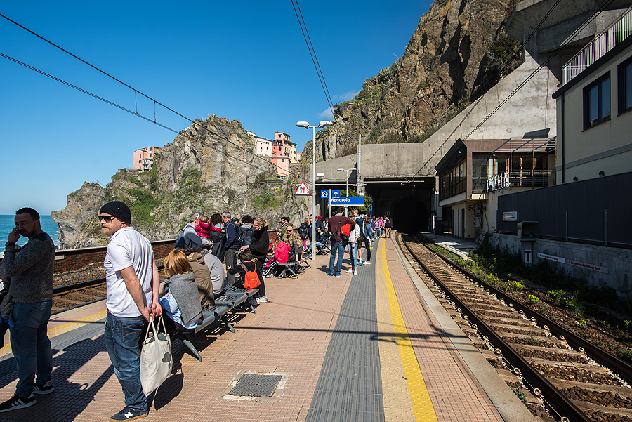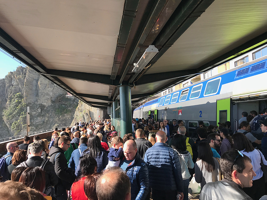 Grįžtam šiaip ne taip i savo jaukiąją Manarolą. Traukinių stoty susigrūdimas, žmonių minia nori išvažiuoti, kita minia nori patekti į miestą, praėjimas nuo perono link tunelio į kaimelį tik vienas, o žmoniųųųųųųų...! Judam lėtai, bet šiaip ne taip pralendam.