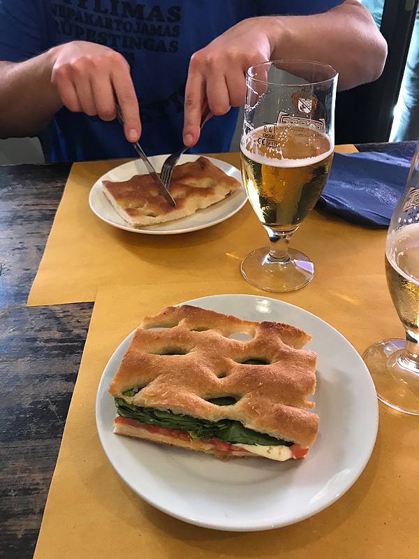 Atgaunant jėgas bariuke senamiestyje, suprantam, kad iki traukinio platformos yra eilė! Ir gan nemaža. Teks atstovėti. Nuotraukoje - ragaujam fokačią - ji storulė, ne tokia, kokia mes įpratę valgyti - ploną, traškią.