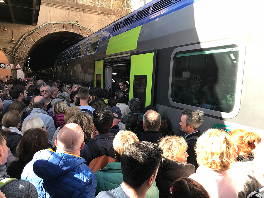 Šįkart traukinys vėluoja 20 min! Kai atvažiuoja ir atidaro duris, suprantame, kad viduje žmonėms buvo nelengva - susigrūdę, visi susitaršę, lipa tuntais iš traukinio, išgirstu: "Mamma mia"!!