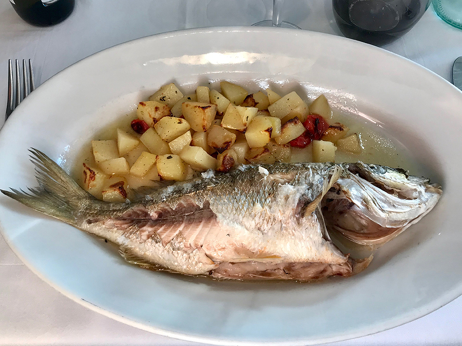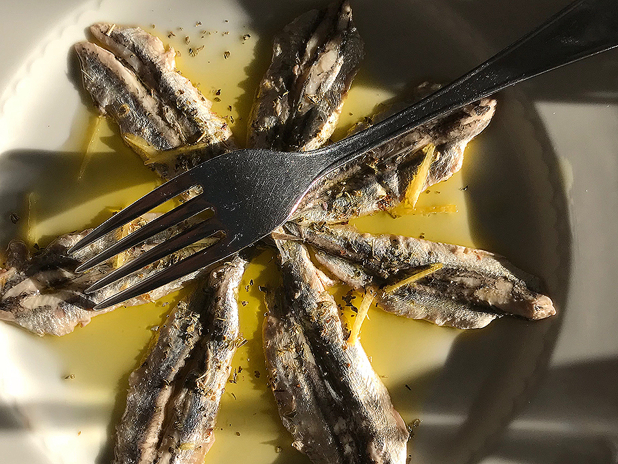 Cintinoj (?? pati nežinau, kas tai) marinuoti ančiuviai - neypatingai patiko, nors čia daug kur galima ragauti įvairiai paruoštų ančiuvių. Kaimynai valgo makaronus su omaru. Aš renkuosi žuvytę šios dienos sugavimo. Atneša man ją, žalią, parodo, ar gera. Patvirtinu.