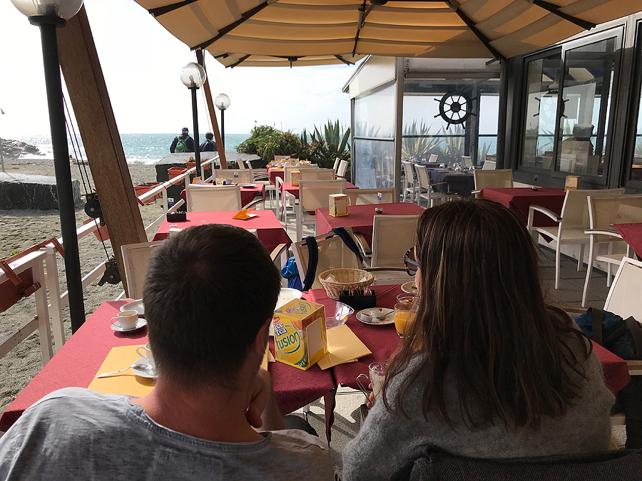 Kitą rytą laukia ilga 12 val kelionė namo - penkiais traukiniais iki mūsų kaimuko šalia Ciūricho. Žmonių susigrūdimo stotyje nebeliko. Važiuojame iki Monterosso, valgom angliškus(!!!) pusryčius vietinėje kavinukėje. Vyras dar ryte pasakė - nenoriu jų batonų pusryčiams, aš sakau, nu jau kiaušinienės su kumpiu vargu ar gausi Italijoje. Ir va - turizmas daro stebuklus, gaunam ir kiaušinienę, ir kumpį, ir visą angliškų pusryčių meniu su vaizdu į Viduržiemio jūrą.