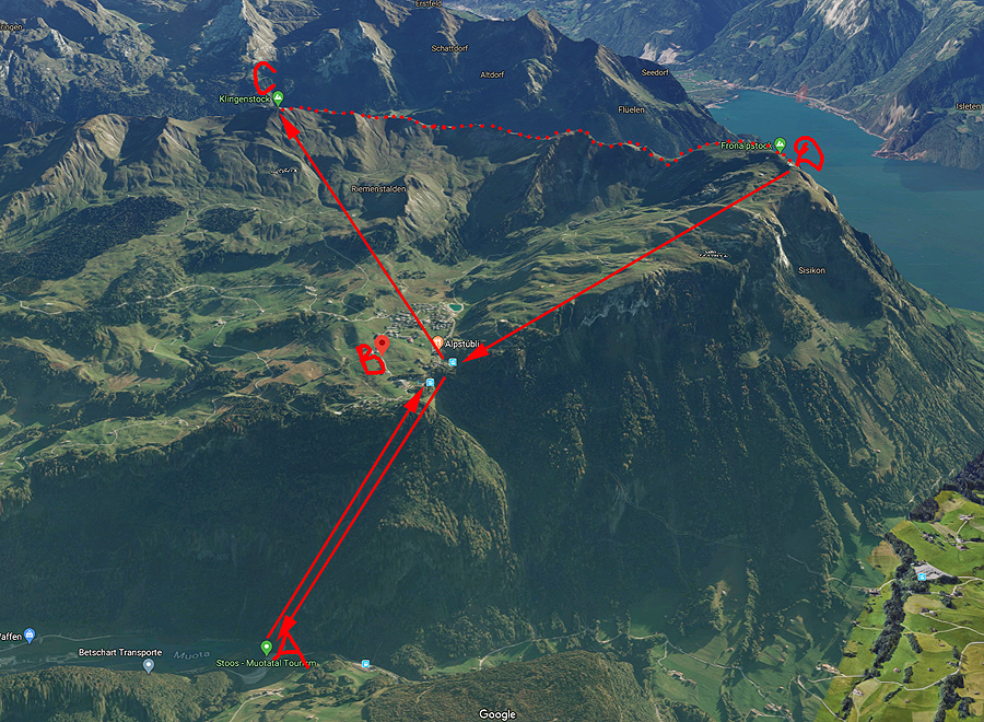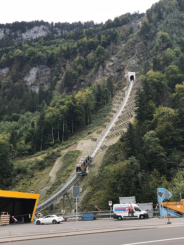 Iš keltuvų stoties Standseilbahn Schwyz-Stoos (A) važiuoju tituluojamu stačiausiu pasaulyje nesenai įrengtu apvaliu geltonu keltuvu į Stoos (B), kuris yra 1300m aukštyje virš jūros lygio. Keltuvas perveža 1500 keleivių per valandą ir kelionė trunka 4-7 minutes, žymiai greičiau, nei su senuoju keltuvu.