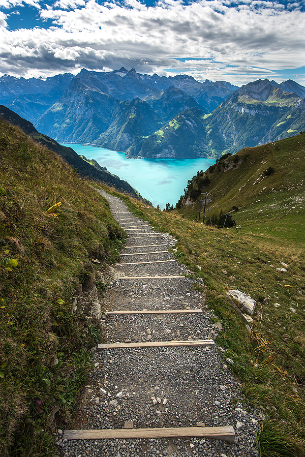 Smaragdo mėlynumo ežerai snieguotų kalnų fone, nesuskaičiuojami laipteliai, superfotogeniškas takas - tai ėjimas nuo Fronalpstock iki Klingenstock kalnų viršūnių. Kelionė prasideda iš Stoos miestelio. Skaityt reikia Štos. Tai mažas miestukas, esantis centrinėje Šveicarijoje, Švyco kantone, į kurį nėra mašinų kelio, turintis tik apie 100 gyventojų ir pora viešbučių turistams. Žiemą Stoos virsta šurmuliuojančiu slidinėjimo kurortu.