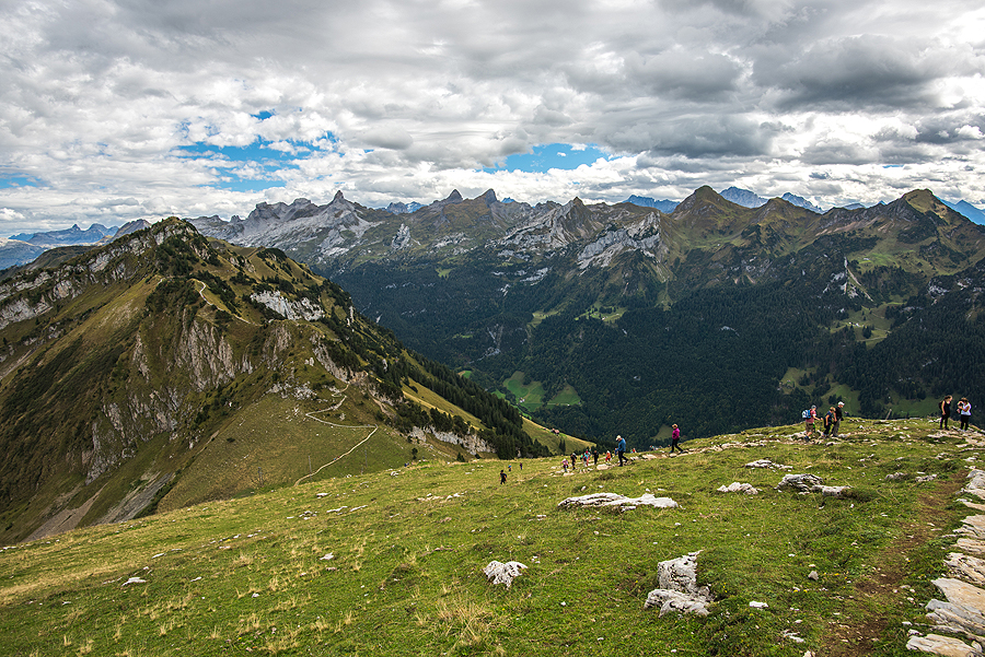 Leidžiuos, leidžiuos, apie 400m žemyn. Ir matau kalną, į kurį reiks užkopti - 380m aukštyn. Fronalpstock viršūnė ir mano ėjimo galas jau nebetoli.