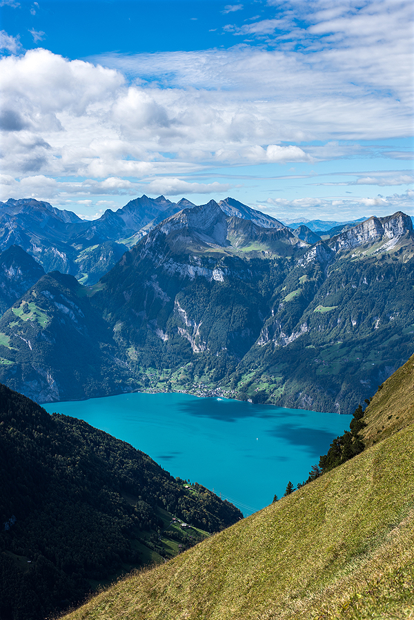 Neužilgo pasimato Vierwaldstättersee ežeras, paprastai vadinamas Liucernos ežeru. Jo vanduo keičiasi priklausomai nuo saulės, dažniausiai jis - turkio mėlynumo spalvos. Šioj foto kiek priblėsęs.