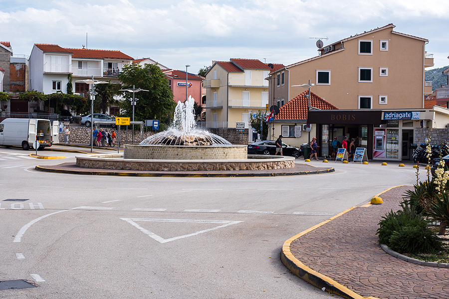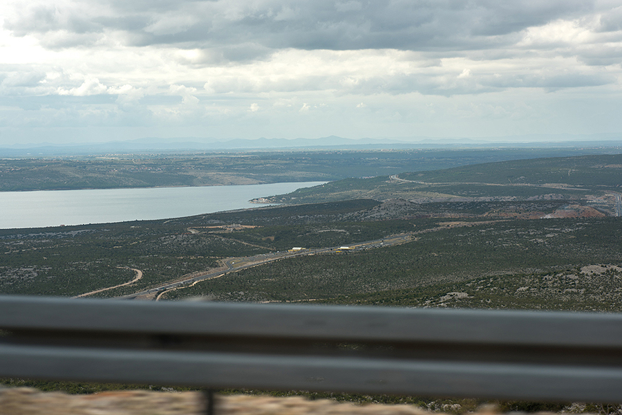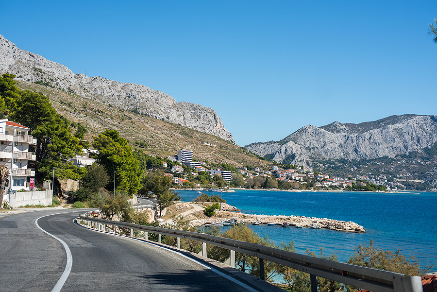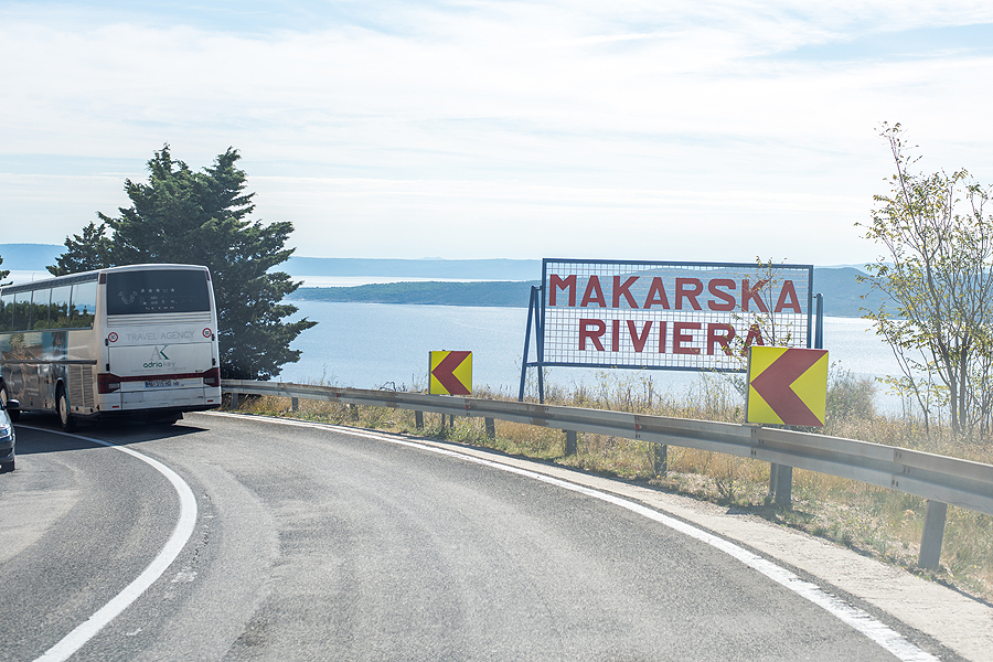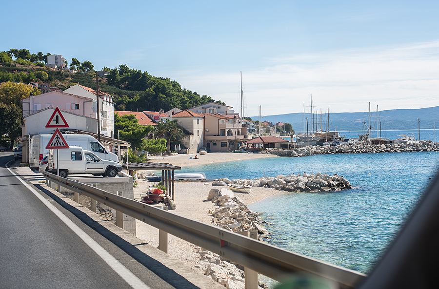 Kelias gan tuščias, bet važiuojasi vis tiek lėtai. Girdėjau, sezono metu čia ištisiniai kamščiai. Čia važiuojame palei Brač salą - kokia ji didžiulė... Dar užmetu akį į Omiš - iš internetinių vaizdų atrodė vertas sustojimo taškas, bet nestojam, įspūdžio pravažiuojant didelio nepadaro.