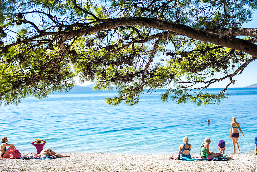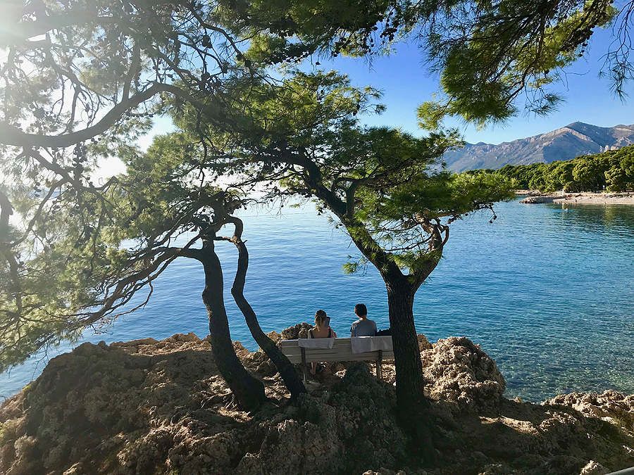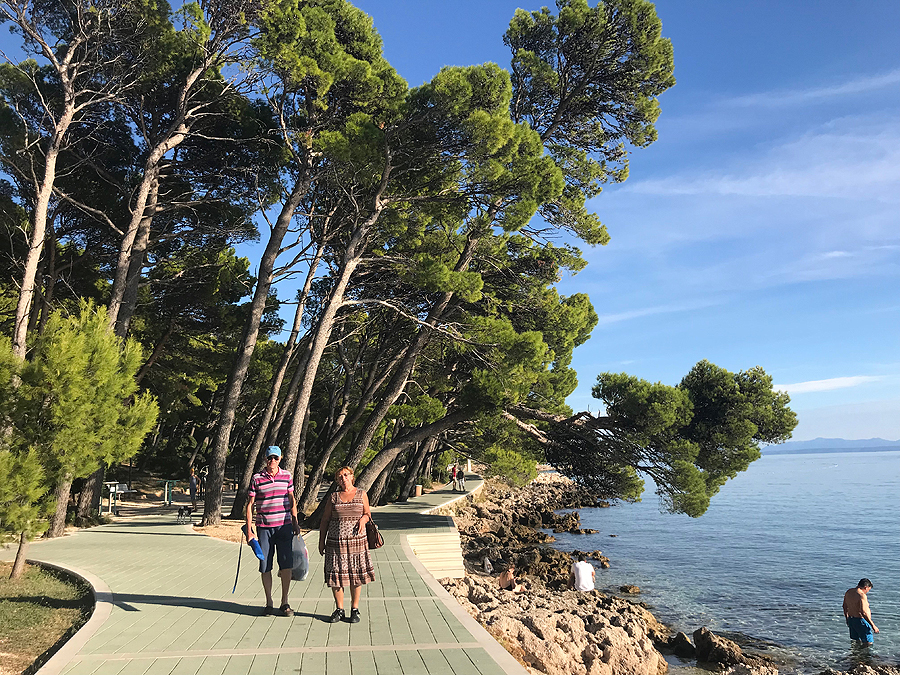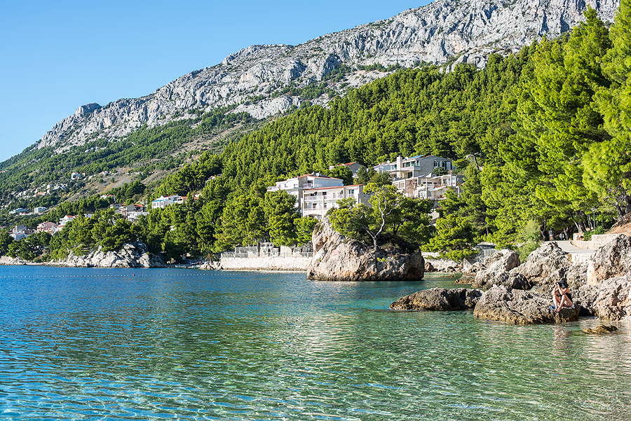 Nuo Splito vingiuojam siauru pajūrio keliuku ir vėpsom pro langus i fantastišką panoramą - žydrą jūrą, vienišus tuščius paplūdimiukus, miestelius. Pravažiuojam tiek tuščių žydrų paplūdimių šalia kelio, kad galvoju, man bus riesta, jei Brela pasirodys esanti skylė.