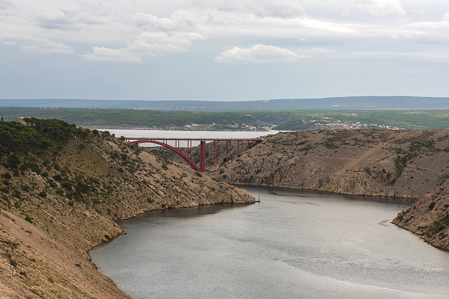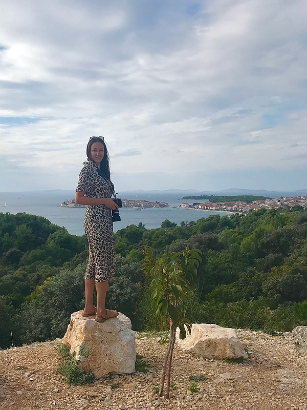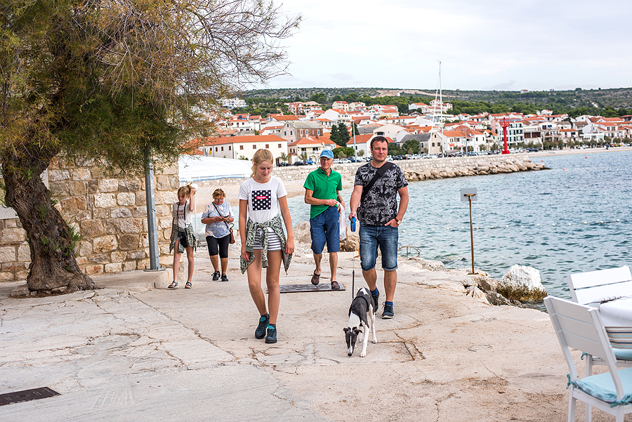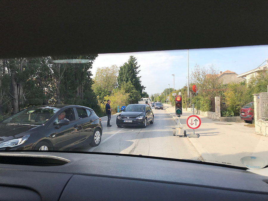 Nuvažiuojam paspoksot į Primošten, vyras vaikams sako Primušten, bet jos nereaguoja. Didelė mašina, negirdi bajerių. O gal nesupranta. Primošten (kilęs nuo žodžio tiltas kroatų kalba) - miestelis saloje su siauru įėjimu. Čia sustojam panoramai, bet saulės nėr, plokščia viskas...