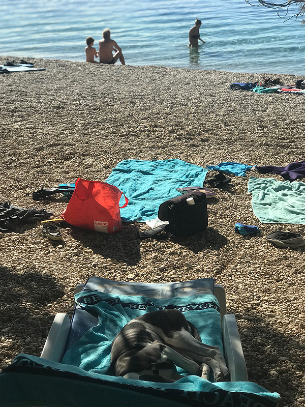 Atvažiuojam, einam su manta kokį kilą žemyn iki gražiojo paplūdimio. Ir jis nenuvilia! Aišku, su šunimis negalima. Bet mūsiškis ramutis, jei mes netoli. Šuo ant gulto pavėsy pliažo kampuky, mes šalia saulėje, nieks nesikabinėja.