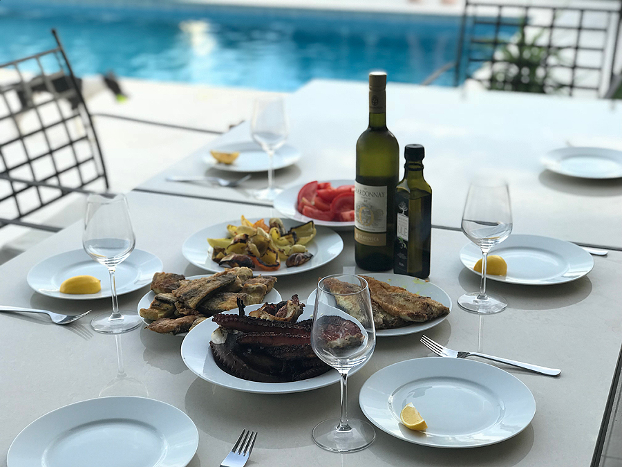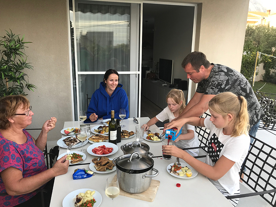 Grįžę gaminamės vakarienę iš ryte pirktos žuvies. Svogūnai, paprika ant grilio, mmmm, tokių skanėstų čia nenusipirksi. Kažkaip pritrūko mum skanaus maisto Kroatijoje... Atrodo visko yra, ir restoranuose netaupėm, užsisakinėjom, ką norėjom, bet...