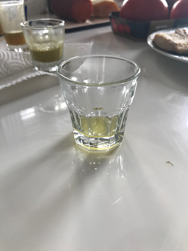 Šiandien iki 12 reik išsivyniot. Pusryčiaujant vyras su uošviu eksperimentuoja - spaudžia aliejų iš 20 nusiskintų alyvuogių. Kaitina, košia - kažkas gaunas. Kartokas, skonis ilgai sėdi ant liežuvio.