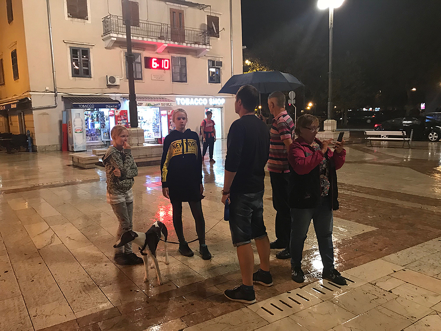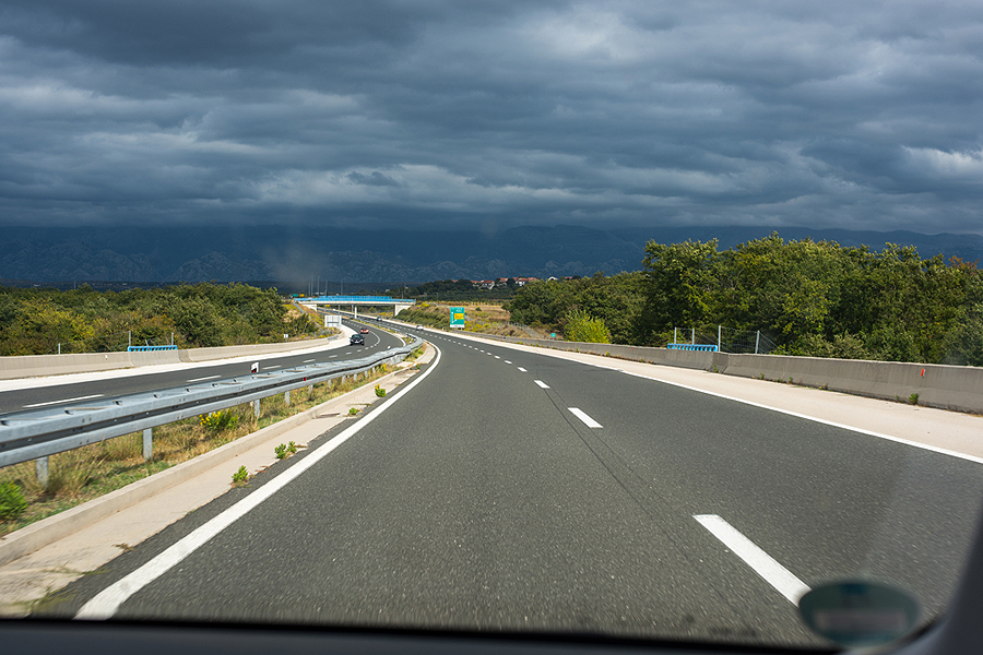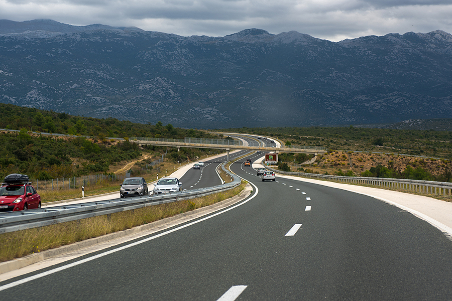 Plynas akmenynas - išvada važiuojant magistrale tarp Splito ir Zadaro. Ženklai apie vaikštančias meškas ir vilkus. Nuo Zadaro link Rijekos vėl plyni laukai, paparčių plantacijos ir mažai civilizacijos. Vėl žadejo lietų, lynojo pas mus prie Kaštelos, pavažiuojam kiek, lyt nustoja, lenda saulė. Stojam užkąst ir kavos degalinėj, įrengti staliukai, nemažai žmonių, bet šiukšlių ant žemės daug...