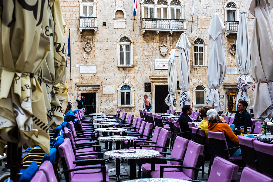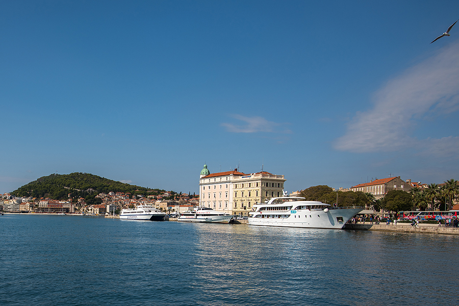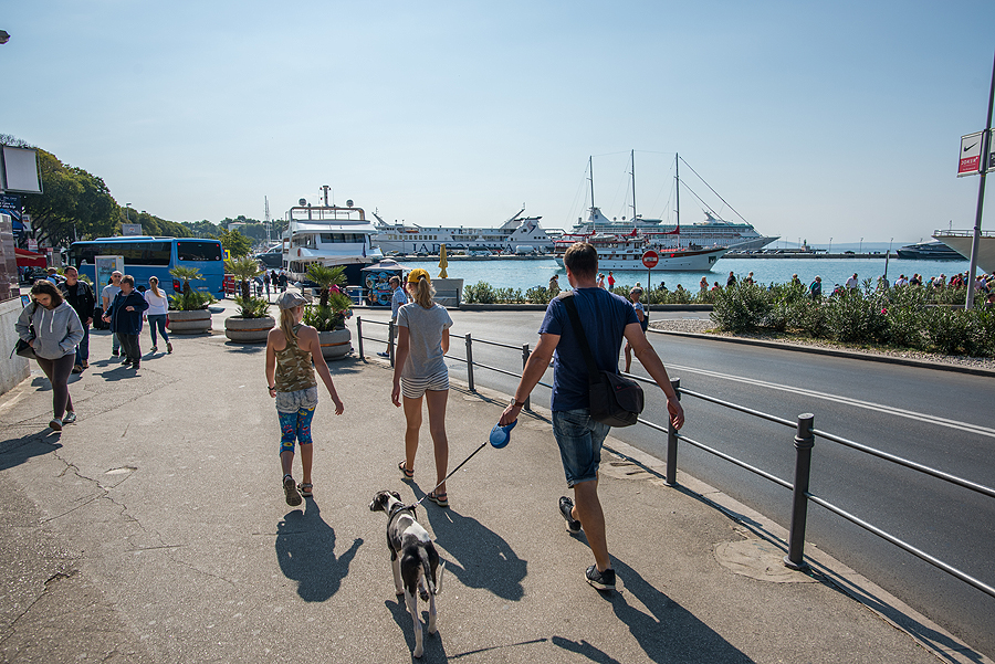 Triukšmingas uostas, atvykę bandom susigaudyt laivų ir keltų plaukimo tvarkoje. Uostas didžiulis, milijonas turistinių agentūrų, siūlančių plukdyt visur. Iš Splito galima nuplaukti į visas salas, daug žmonių plaukioja maršrutu darbas-namai. Žiūrim, kur galim patys nukakt. Vieni laivai plaukia tik į Hvar, arba vienas laivas kaip maršrutkė per dieną aplanko visas salas, bet gali rinktis tik jį vieną, kiti neplaukia, negali išlipt vienoj saloj porai val., plaukt toliau, išlipt kitoj... ne, įlipai ir tavo bėdos - plauk iki galutinio taško arba neplauk. Agentūros plėšia nežmonišką kainą 600-900eu už privatų laivą ar 10 žmonių laivą. Sunku savarankiškai susigaudyti kas kur ir kaip. Prisifotkinam tvarkaraščių ir einam į miestą - pastudijuosim namuose.