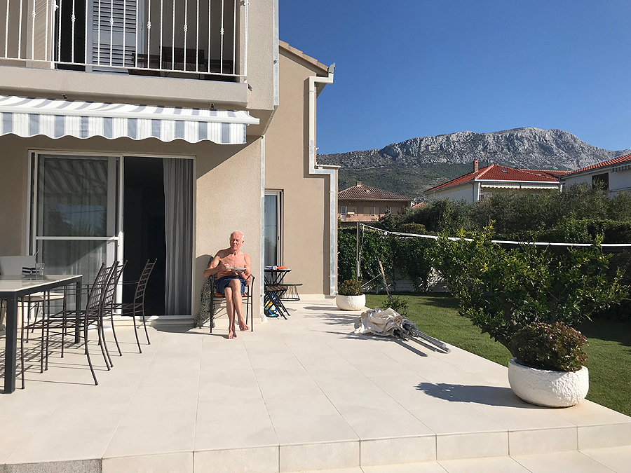 Grįžtam namo, kas į baseiną, kas su knyga ant gultų šalia baseino. Vakaras su vietiniu baltu Graševina ir raudonu Dalmatinac vynu ir Paškij sūriu iš Pago salos - vėlgi - mūsų šveicariškas Grueres skanesnis.