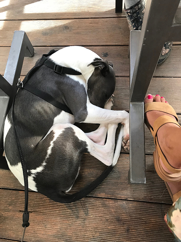 Nuostabi diena. Vakaras su vynu ir sūriu, baseinas beveik sušilęs po šiltos dienos, bet vakaras plius 20, nesigundom lyst maudytis. Šuo krenta išklotine ant lovos ir sminga.