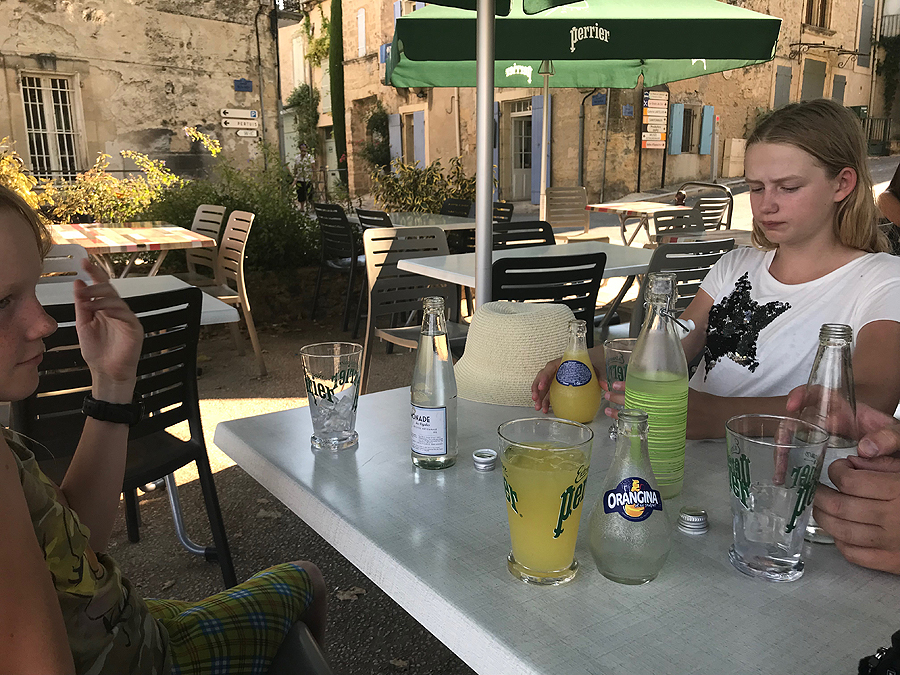 Prisėdame bariuke atsigaivinti. Kokia skani ta Orangina su ledukais!