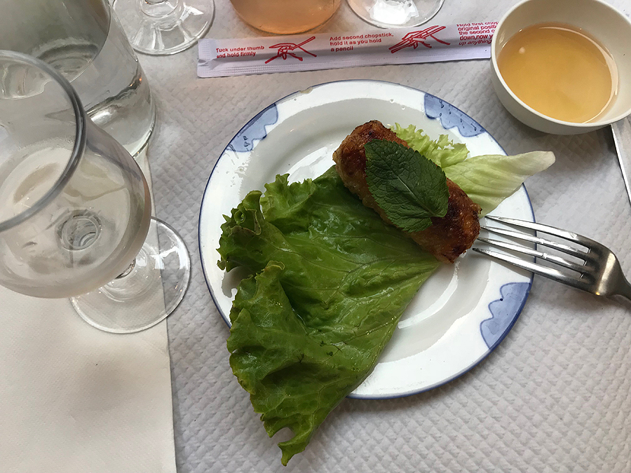 Baro savininkas rodo, kaip reikia valgyti Spring Rools'us - įsidedi salotos lapą, rollsą, mėtos lapelį, užpili padažo, viską susuki ir valgai.
