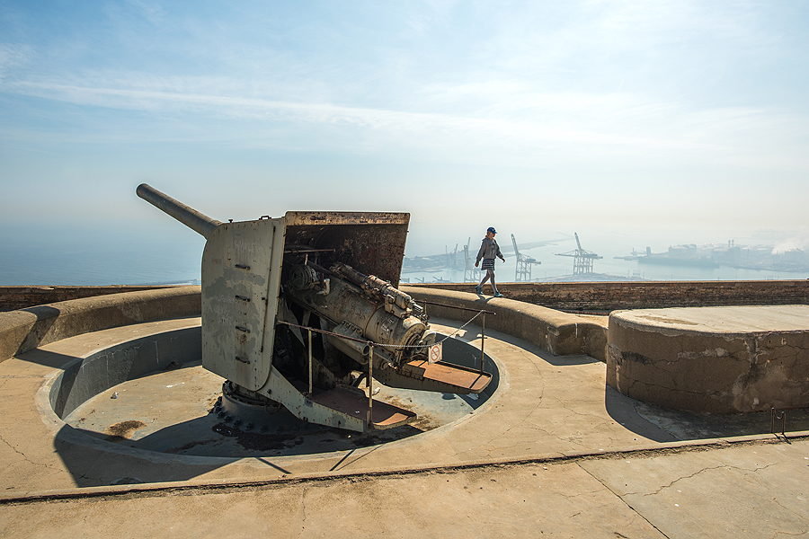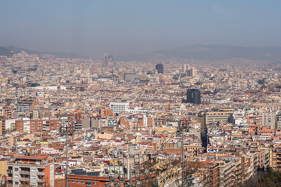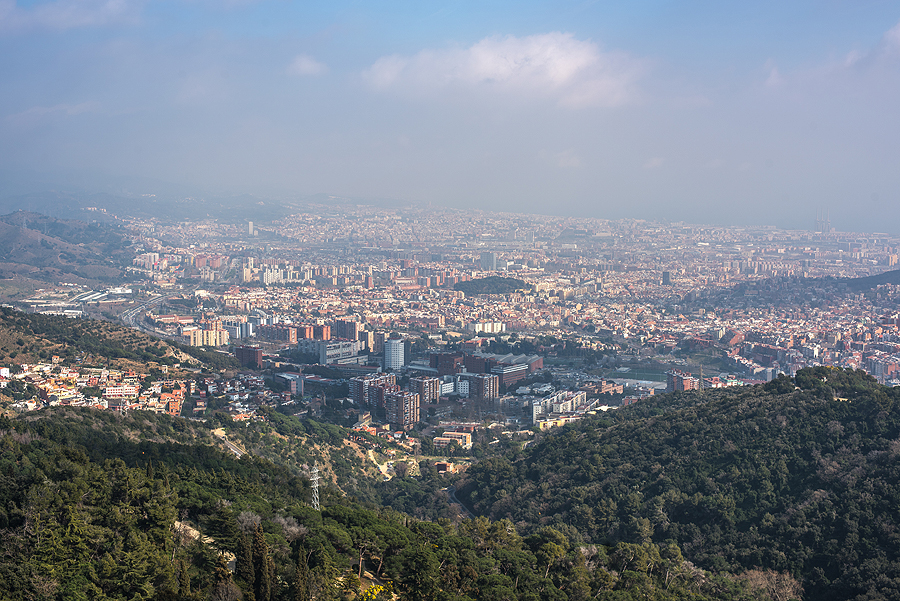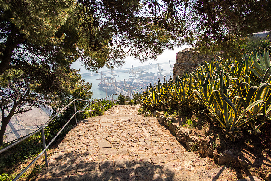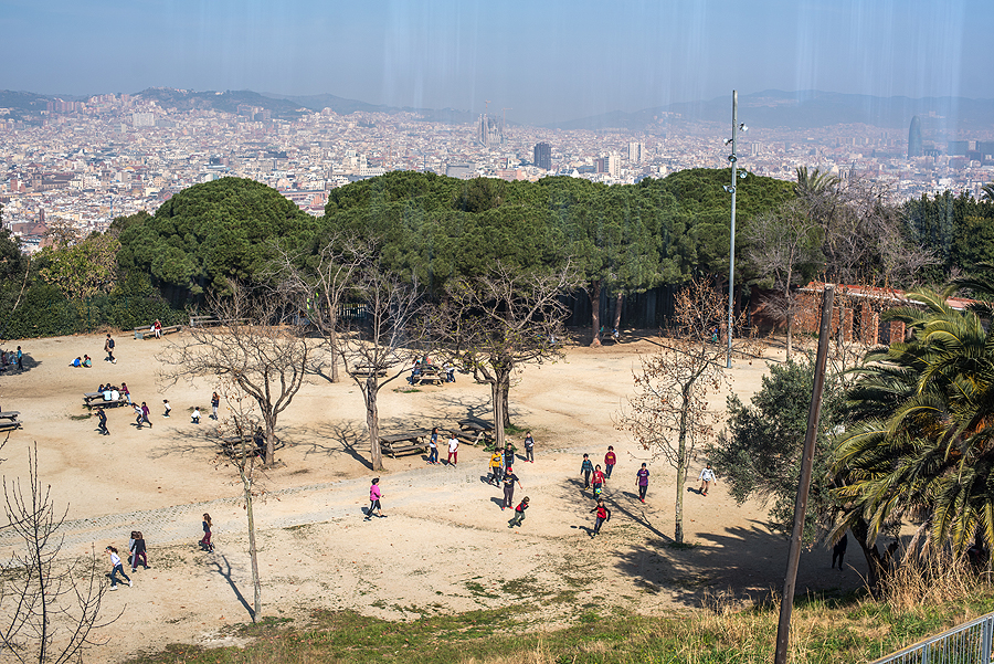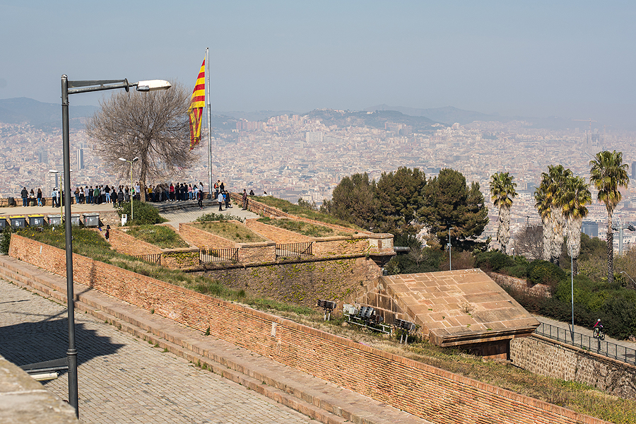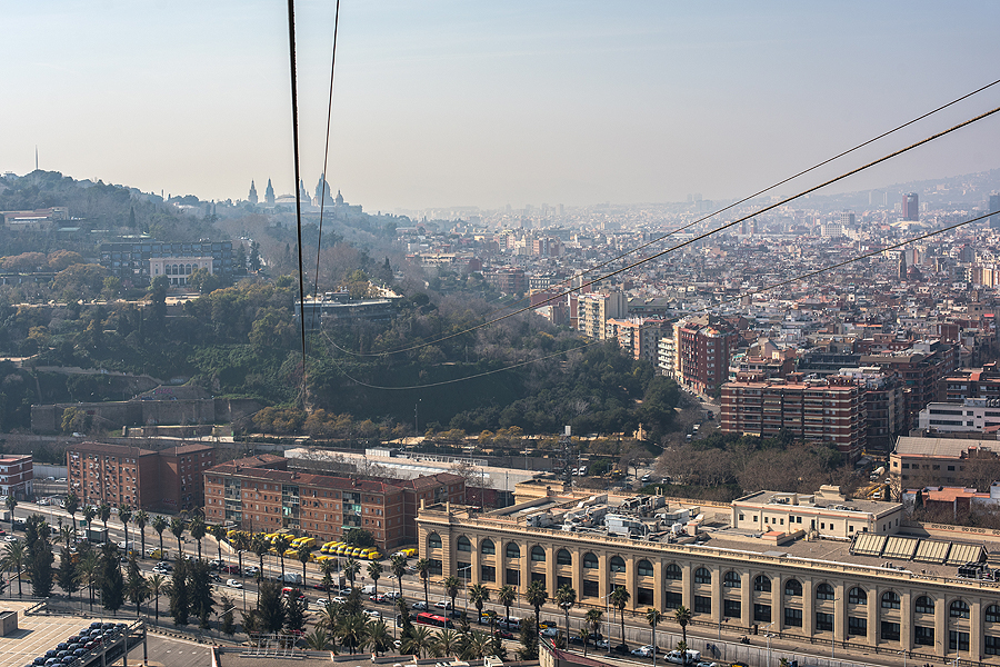 Atvažiavę į Paralel sustojimą, matom, kad iki keltuvo mūsų iš čia nenuveš, uždarytas traukinys. Yra nuorodos į autobusą, kuris veža į kalną, į pradinį užsikėlimo tašką, kur yra keltuvai. Ok, einam. Autobuso ir traukinio bilietai - tie patys, galioja ta pati kortelė, kiši tris kartus į aparatą, ir važiuoja trys žmonės. Lipam į keltuvą, keliamės iki Castel de Monjuik. Žvalgomės, Barselona traukiasi ir virsta dideliu namų kratiniu. Tolumoj per rūką matyti gražuolė Sagrada Familia.